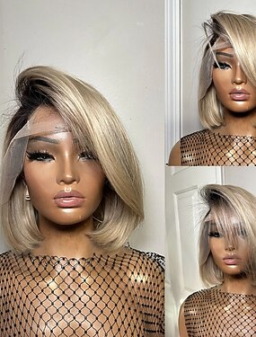 Peruca curta bob com cabelo humano, fecho 5x5, lace front 13x4, repartição central, cabelo brasileiro liso, loiro acinzentado, castanho, multicolorida, com baby hair, mechas/balayage, linha capilar