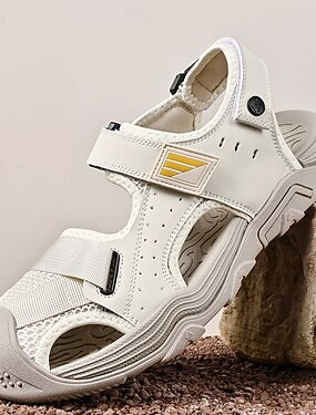 Sandálias brancas masculinas para uso externo, com tiras ajustáveis com fecho de velcro, sola com amortecimento, modelo prático e confortável para viagens e uso diário.
