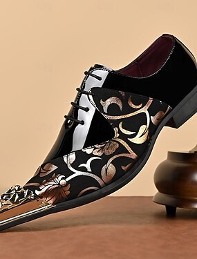 Sapatos sociais masculinos pretos com estampa floral, bico fino e biqueira metálica. Modelo elegante com cadarço, ideais para casamentos, festas, banquetes e apresentações de palco.