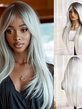 Perucas sintéticas Uniformes Trajes de carreira Princesa Liso Kinky Liso Parte do meio Corte em Camadas Com Franjas Fabrico à Máquina Peruca 22 polegadas Cinza prateado Cabelo Sintético Mulheres