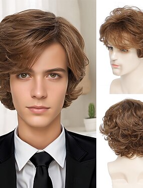 Perucas sintéticas Encaracolado Curva solta Parte do meio Corte Assimétrico Fabrico à Máquina Peruca 12 polegadas Castanho Claro Cabelo Sintético Homens Clássico Marrom