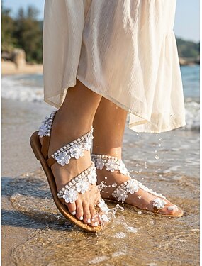 Sandálias rasteiras femininas em renda branca marfim, elegantes sapatos de noiva boho para casamento na praia.