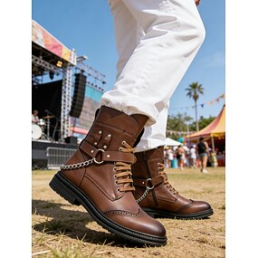 Botas de combate masculinas marrons com cadarço, zíper lateral e detalhe de corrente, ideais para festivais de música, shows, eventos ao ar livre, streetwear, festas e um estilo robusto e marcante.