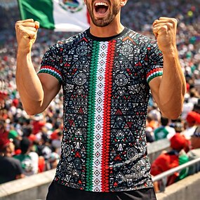 Camisa de futebol masculina inspirada no México – camiseta de torcedor com estampa asteca em preto, verde e vermelho, confeccionada em tecido de malha respirável de secagem rápida e com proteção solar