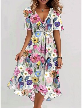 Mulheres Vestido midi Vestido A Line Férias Casual Feriado Encontro Normal Floral Gráfico Manga Curta Decote V Azul Rosa Claro Amarelo Rosa Verão Primavera