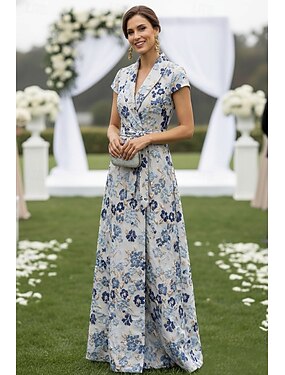 Linha A Longo Camisetão Vestido de convidada de casamento Vestido formal Vestido Para Mãe dos Noivos Manga Curta Decote V Colarinho de Camisa Elegante Formal Convidado do casamento com Faixa / Fita