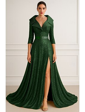 Linha A Longo Vestidos de noite Vestido de Baile Vestido formal Elegante Brilhante Sedoso Meia Manga Lapela Formal Casamento Cinto / Faixa Paetês com Purpurina Pregas