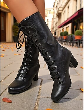 Botas femininas pretas de salto médio com cadarço – botas urbanas chiques de couro sintético estilo vitoriano para uso casual de rua, passeios de outono e estilo diário