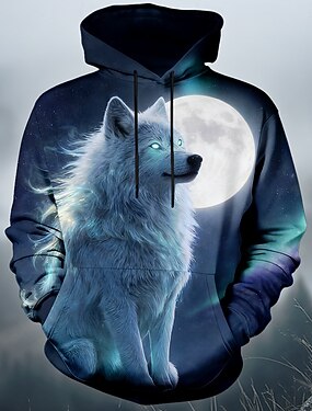 Homens MOON Lobo Moletom 3D Fantasia. Gola Redonda Streetwear Bandagem Presente Azul Azul 3# Azul 2# Com Cordão Outono Inverno Designer S M L XL XXL XXXL