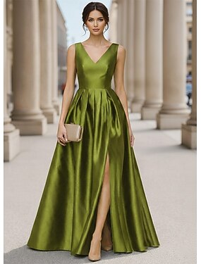 Linha A Longo Vestidos de noite Elegante Diário Sem Manga Decote V Casamento Formal Tafetá com Pregas Fenda
