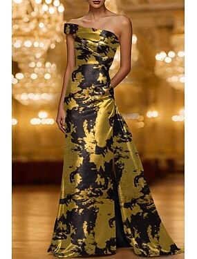 Linha A Longo Vestidos de noite Vestido de Baile Vestido formal Elegante Vintage Split alta Sem Manga Assimétrico Casamento Formal Bolsos Cetim Fibra Sintética com Estampa floral