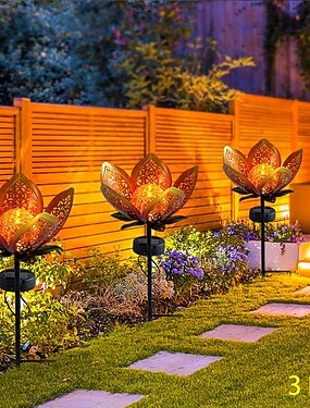 Conjunto de 3 luminárias solares externas à prova d'água em formato de lótus, feitas de ferro oco, com projeção, lâmpadas decorativas de LED para jardim, quintal, gramado, caminho, casa de campo e