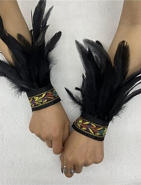 Carnaval 2026 - Acessórios de Samba do Carnaval do Rio - Manoplas de Pulso de Pena Preta Feminina com Laço de Fita Bordada Vintage
