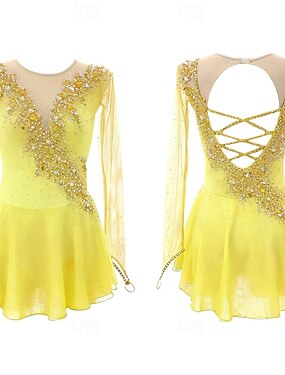 Vestidos para Patinação Artística Mulheres Patinação no Gelo Vestidos Azul marinho Preto Amarelo Patchwork Thumbhole Com Stretch Treino Competição Roupa para Patinação Clássico Cristal / Strass Manga