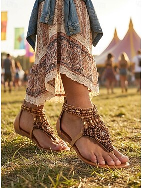 sandálias femininas boho com tiras em T e detalhes em strass – sapatos baixos elegantes e confortáveis para o verão, praia e ocasiões casuais
