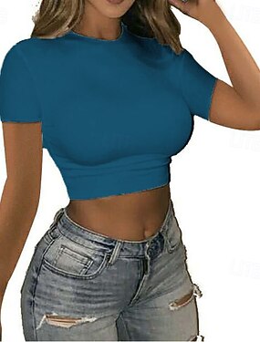 Mulheres Wrap Crop Top Tecido à moda Manga Curta Gola Redonda Tops regulares Azul Preto Branco Vinho Marron Verão