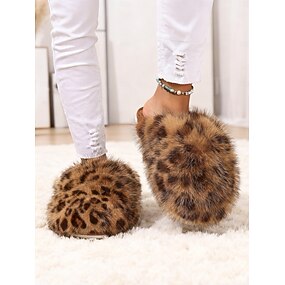 Pantufas femininas de pele sintética com estampa de leopardo – calçado macio e aconchegante para uso interno, ideal para relaxar, descansar e se sentir confortável em dias frios.