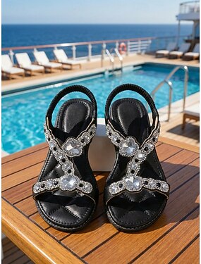 Sandálias rasteiras femininas pretas com strass – calçados confortáveis e brilhantes com cristais, ideais para férias na praia, resorts, relaxar à beira da piscina, festas de verão e passeios noturnos.