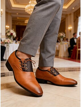 Sapatos sociais masculinos em tom castanho com design moderno, ideais para cerimônias de casamento e ocasiões formais.