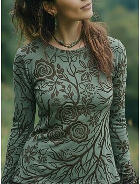 Mulheres camisa Boho Camiseta Imprimir Gráfico Boêmia Vintage Casual Manga Longa Gola Redonda Tops regulares Diário Final de semana Roupas de férias Verde Verão Primavera Outono