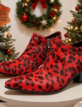 Botas masculinas de couro com estampa de leopardo vermelho – calçados natalinos chamativos para festas de fim de ano e ocasiões festivas casuais