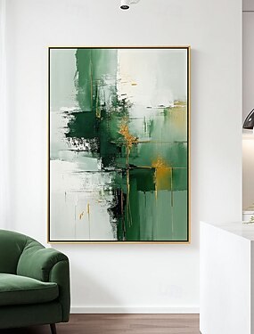 Pintura original a óleo verde, pintura abstrata feita à mão, pintura com textura dourada, minimalismo, arte de parede verde, grande arte texturizada 3D verde, pintura moderna em tela verde.