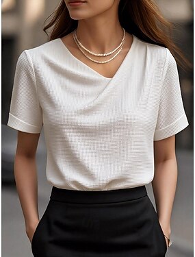 Mulheres Camiseta T-shirt Franzido Tecido Elegante Moda à moda Manga Curta Decote V Tops regulares Casual Diário Para Noite Branco Rosa Damasco Cinzento Verão Primavera