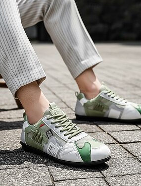 Tênis esportivo masculino verde e branco, calçado atlético confortável com cadarço para uso casual e atividades ao ar livre.