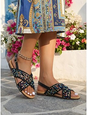 Sandálias rasteiras femininas pretas com lantejoulas multicoloridas – design brilhante com tiras cruzadas, sola macia e confortável, perfeitas para festas de verão, férias, festivais e momentos de lazer.
