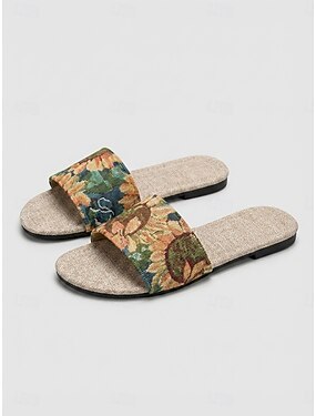 Sandálias femininas vintage com estampa floral em tapeçaria - rasteirinhas boêmias em linho bege, perfeitas para férias em ilhas paradisíacas e resorts de praia tropicais. &roupa casual de férias de