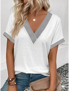 Mulheres Camiseta Patchwork Listrado Clássico Casual Manga Curta Decote V Tops regulares Diário Para Noite Final de semana Branco Verão Primavera