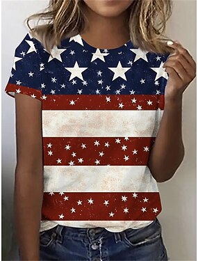 Dia da Independência Americana Mulheres Camiseta Imprimir Gráfico Bandeira à moda Clássico Casual Manga Curta Gola Redonda Decote Redondo Tops regulares Diário Azul Branco Vermelho Verão Primavera