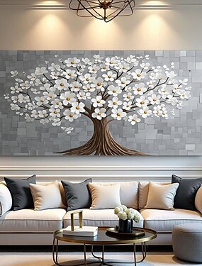 Árvore de flores brancas em 3D, arte em forma de torre sobre tela, pintura com espátula, texturizada, pintada à mão, estilo minimalista, decoração para sala de estar.