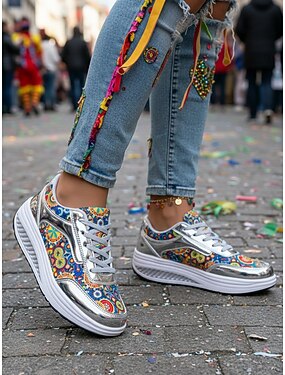 Tênis de Plataforma Metálico Dourado Femininos para Mardi Gras com Estampa Paisley Colorida – Sapatos Brilhantes de Plataforma para Dança Festas e Festivais de Carnaval