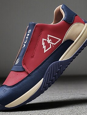 Tênis masculino retrô colorblock com cadarço, nas cores azul marinho, vermelho e amarelo. Leve e ideal para caminhadas, viagens, uso diário e estilo urbano.