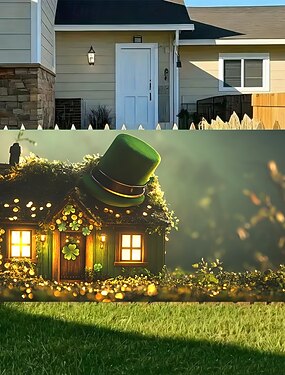 Banner de jardim para o Dia de São Patrício, decoração externa, casa de duende, trevo, moeda de ouro, cobertura de cerca, placa grande para quintal, artigos para festa, painel de fundo para parede.