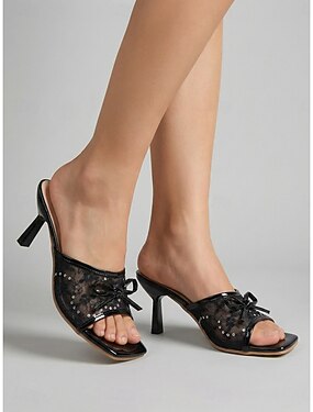 Mules femininas elegantes de salto alto em tela preta - sandálias sensuais de bico quadrado com laço de strass, perfeitas para férias de verão e festas de coquetel. &looks chiques para o dia a dia