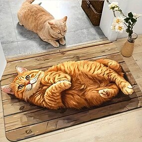 Tapete de entrada com estampa de gato ruivo deitado em tábuas de madeira, ideal para amantes de gatos, adiciona um toque aconchegante à sua entrada e é fácil de limpar.