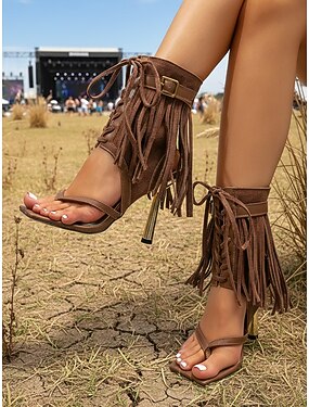 Sandálias femininas boho com franjas e salto agulha - sandálias gladiadoras de camurça marrom com cadarço e franjas, perfeitas para festivais de música. &calçado para festa ao ar livre