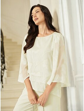 Mulheres Tops de chiffon Pregueado Multi Camadas Metálico Elegante Manga 3/4 Gola Redonda Tops regulares Convidado do casamento Verde Claro Verão Primavera Outono
