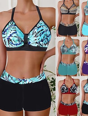 Maiô Feminino Tankini 2 Peças Boy Leg Controle de Barriga Alta Cintura Slim Costas Nuas Roupas de Praia Floral U Decote Sem Mangas