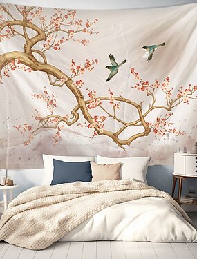 Tapeçaria Floral com Beija-Flores Arte de Parede Grande Tapeçaria Mural Decoração Fotografia Fundo Cobertor Cortina Casa Quarto Sala de Estar Decoração Primavera Verão