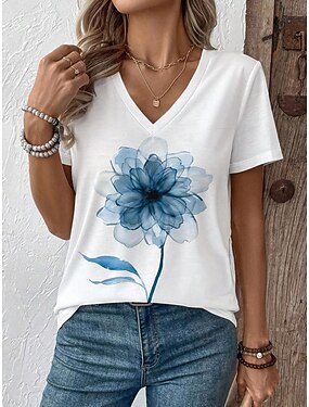 Mulheres Camiseta Imprimir Floral Gráfico Plantas à moda Clássico Casual Manga Curta Decote V Tops regulares Diário Azul Vermelho Roxo Verde Verão Primavera