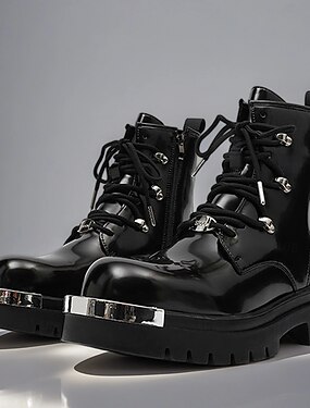 Botas plataforma góticas pretas brilhantes masculinas, botas de combate punk com cadarço e detalhes em placa de metal para festas de Halloween, eventos de cosplay e shows de rock