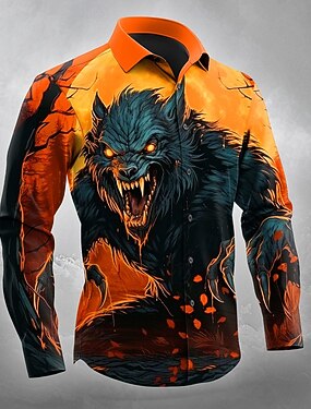 Camisa de Lobo Masculina Camisa de Botão Manga Longa Estilo Gótico Escuro Exterior Férias Primavera Outono Camisas com Gola Impressão 3D Laranja Amarelo Azul Laranja Azul Escuro