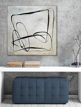 Pintura a óleo artesanal em tela, arte de parede com linhas abstratas e minimalismo em preto, branco e cinza, ideal para decoração de casa. Enrolada, sem moldura e sem esticar, esta pintura mural pode