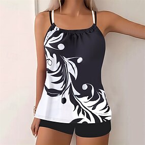 Mulheres Roupa de Banho Tankini 2 partes Calção roupa de banho Compressão abdominal Cintura Alta Delgado Frente Única Férias Roupa de Praia Floral Decote U Sem Manga Fatos de banho