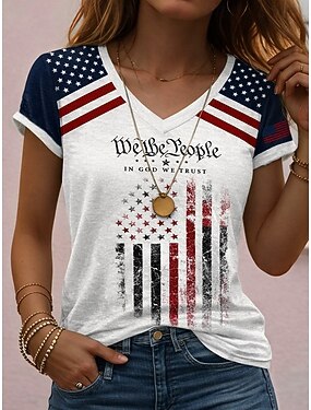 Dia da Independência Americana Mulheres Camiseta Imprimir Gráfico Bandeira Bandeira americana Vintage à moda Clássico Manga Curta Decote V Tops regulares Diário Azul Branco / azul Branco Vermelho