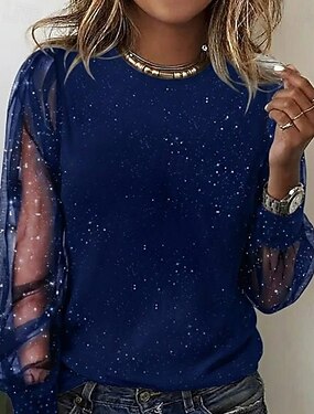 Mulheres Paetês Brilhante De Festa Purpurina Patchwork Com Transparência Tecido Moda Moderno Casual Manga Longa Gola Redonda Tops regulares Diário Final de semana Azul Preto Vinho Outono Inverno
