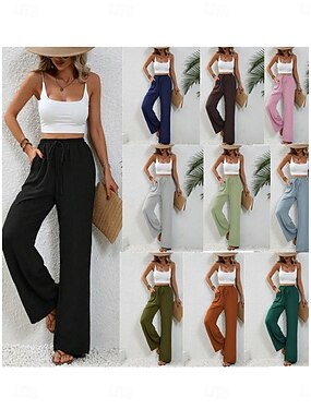 Mulheres Calças de linho de algodão Perna larga chinês Calça verão Férias Roupa de rua Básico Comprimento total Cintura Média Tecido Bolsos Cintura elástica Confortável Conforto Micro-Elástica Ao ar